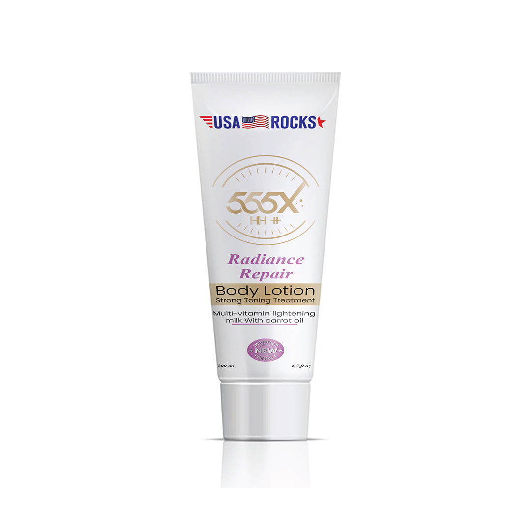 Illuminate and even your skin tone with USA Rocks 555X Radiance Repair Body Lotion. This multi-vitamin lightening milk, enriched with nourishing Carrot Oil and potent antioxidants, works to visibly fade dark spots and sun damage while deeply moisturizing your skin.